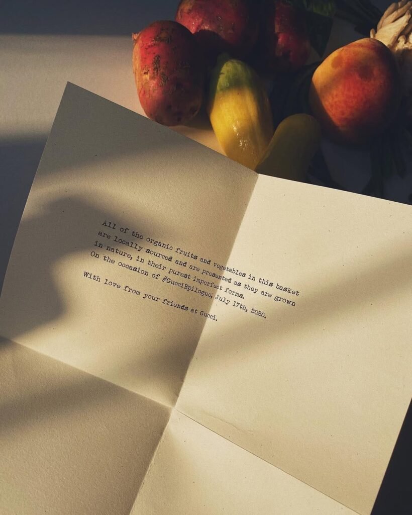 For the Epilogue collection, Alessandro Michele reimagined the fashion show invitation as a grocery delivery. Guests received crates of fresh produce — a vivid echo of the collection’s eclectic, life-filled spirit.