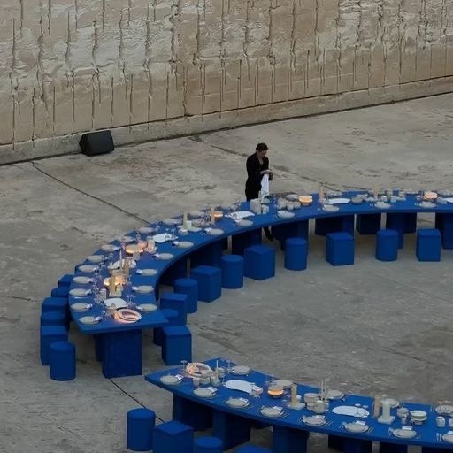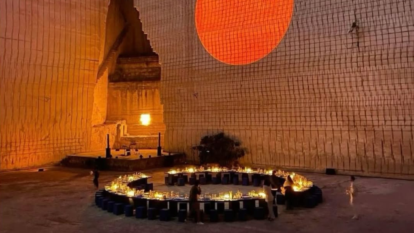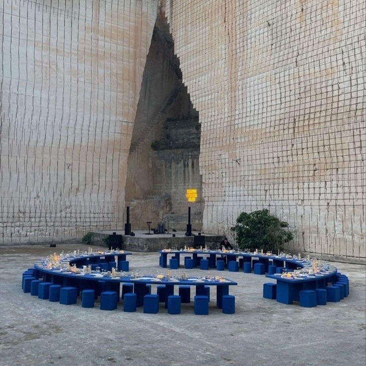 “We have this Mediterranean approach,” Mango creative director Justi Ruano told Coveteur. The Lithica Quarry in Menorca carried that spirit. Its weathered stone walls and sharp industrial lines gave the dinner its structure. A bright burnt-orange sun was projected across the surface, while tables painted in Saint Laurent Majorelle Blue punctuated the pale ground. The staging blended the quarry’s raw form with modern, organic shapes, turning the setting into part of the story.